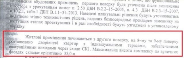 Мало того, в тій же експертизі чітко написано, що висота будинку складатиме 35 метрів. При чому – тільки по фасаду, а в глибині будови – ще вище. Тим часом відповідно до Генплану Києва у центральному історичному ареалі, куди входить і Поділ, висота будівель має бути не вище 27 м.