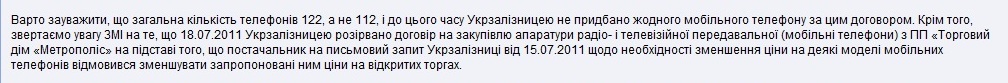 «Крім того, звертаємо увагу ЗМІ на те, що 18.07.2011 Укрзалізницею розірвано договір на закупівлю апаратури радіо- і телевізійної передавальної (мобільні телефони) з ПП «Торговий дім «Метрополіс» на підставі того, що постачальник на письмовий запит Укрзалізниці від 15.07.2011 щодо необхідності зменшення ціни на деякі моделі мобільних телефонів відмовився зменшувати запропоновані ним ціни на відкритих торгах».