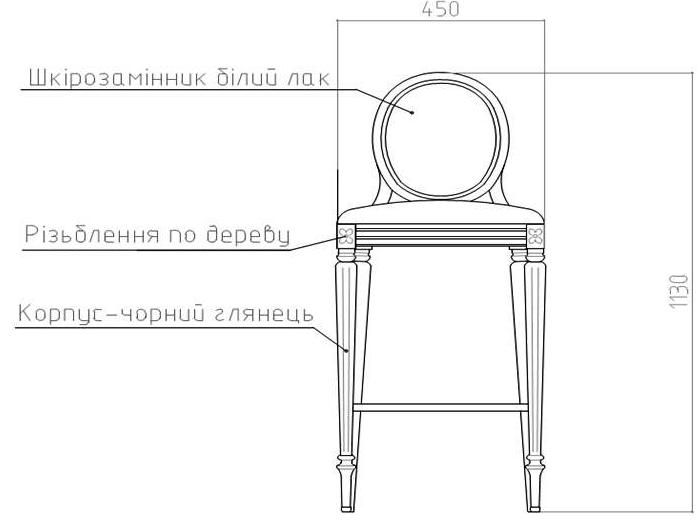 Стілець барний. Колір оздоблення – чорний глянець; матеріал – масив, бук, з елементами різьблення; оббивка – шкірозамінник білий лак. Розміри: висота 113 см х ширина 45 см х глибина 43 см.