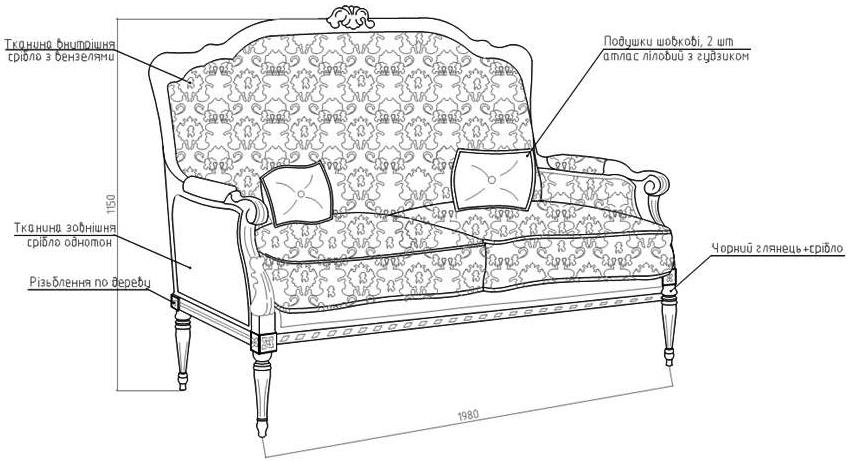 Диван тримісний. Колір оздоблення – чорний глянець + декор срібло; матеріал – масив, бук, з елементами різьблення; тканина оббивки – внутрішня: срібло з вензелями, зовнішня: срібло однотон; кількість подушок – 2 шт. 40 х 40, тканина – атлас ліловий, з гудзиком. Розміри: висота 115 см х ширина 198 см х глибина 86 см.