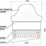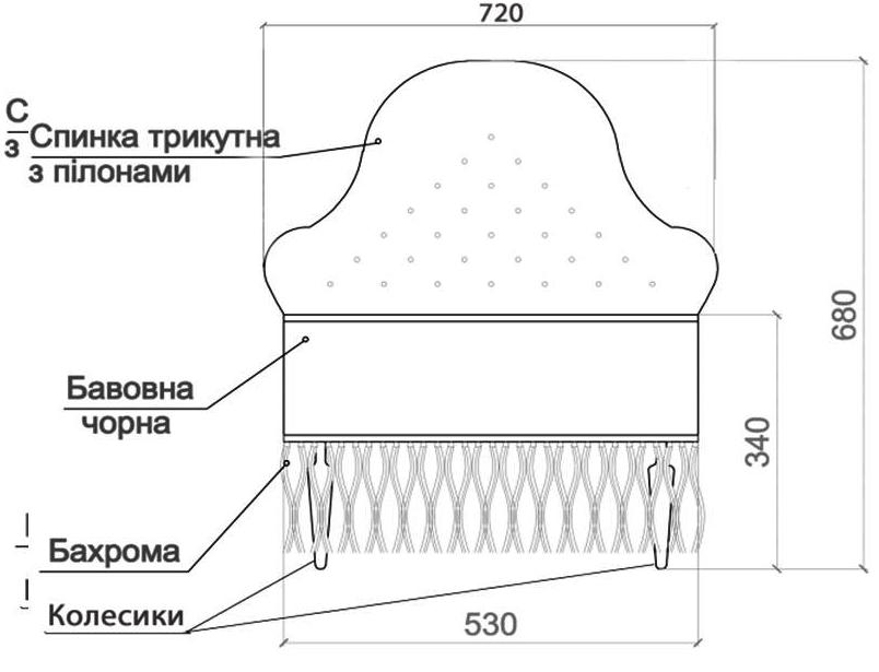 Стілець-крісло кутове. Спинка трикутна, з пілонами, знизу оздоблення бахрома, на колесиках, ніжки – бук. Тканина оббивки – чорна бавовна. Розміри: висота 68 см х ширина 72 см х глибина 53 см.