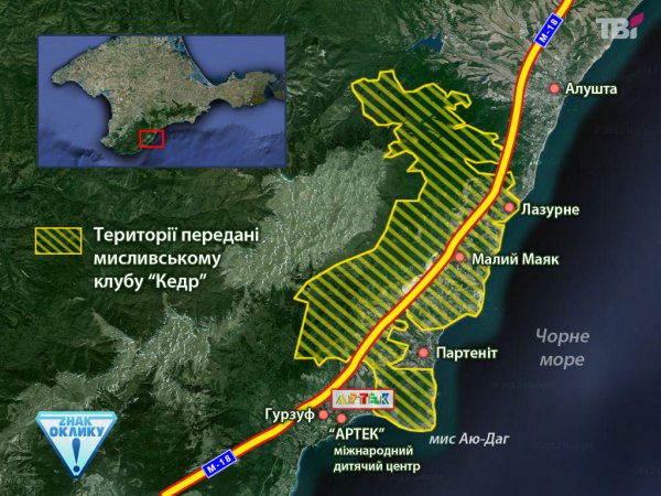 Товариство мисливців і рибалок «Кедр» взяло в оренду 8,8 тис га мисливських угідь між Алуштою і Гурзуфом в Криму, в тому числі знамениту Ведмідь-гору (мис Аю-Даг). Про це пише Дмитро Гнап в блозі на «Українській правді».