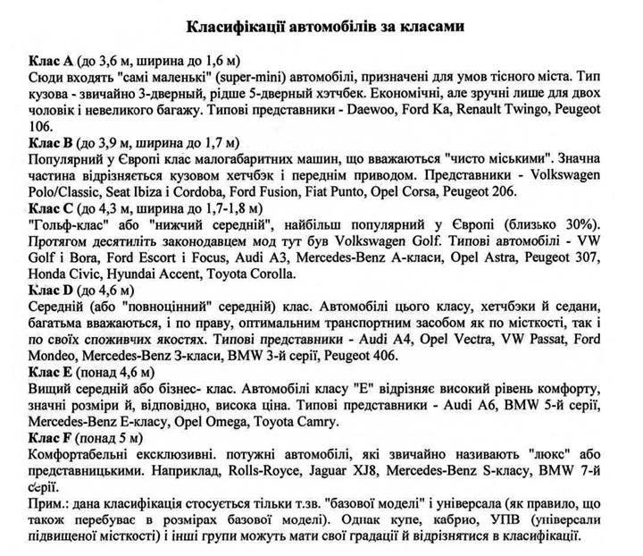 Згідно з конкурсною документацією, послуги мають надаватись чотирма автомобілями класу Е з водіями. Згідно з класифікації КМДА, до класу Е відносяться автомобілі вище середнього або бізнес-класу. Ці автомобілі «відрізняє високий рівень комфорту, значні розміри й, відповідно висока ціна». Типові представники – Ауді А6, БМВ 5-ї серії, Мерседес-Бенц Е-класу, Опель Омега, Тойота Камрі.