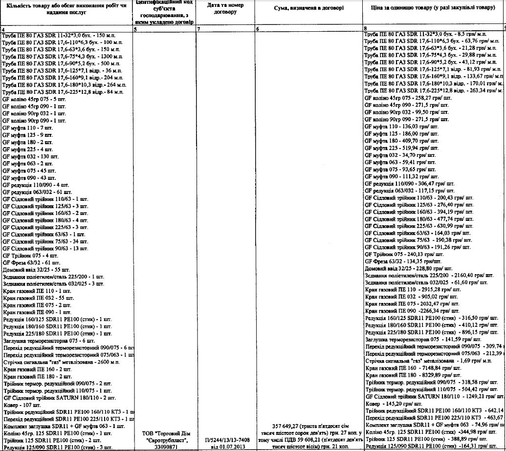 Ціни на продукцію “”Євротрубпласту” з закупівлі “Донецькміськгазу” у третьому кварталі 2013 року