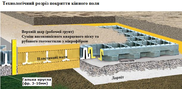Покриття загальним розміром 62х30 м призначено для кінного манежу по вул. Академіка Заболотного, 13 в Києві. Покриття складається з дорніту (поліпропілену), гальки, армуючої сітки, пластикових матів ТТЕ-MultiDraine Plus, піску та рубаного геотекстилю.