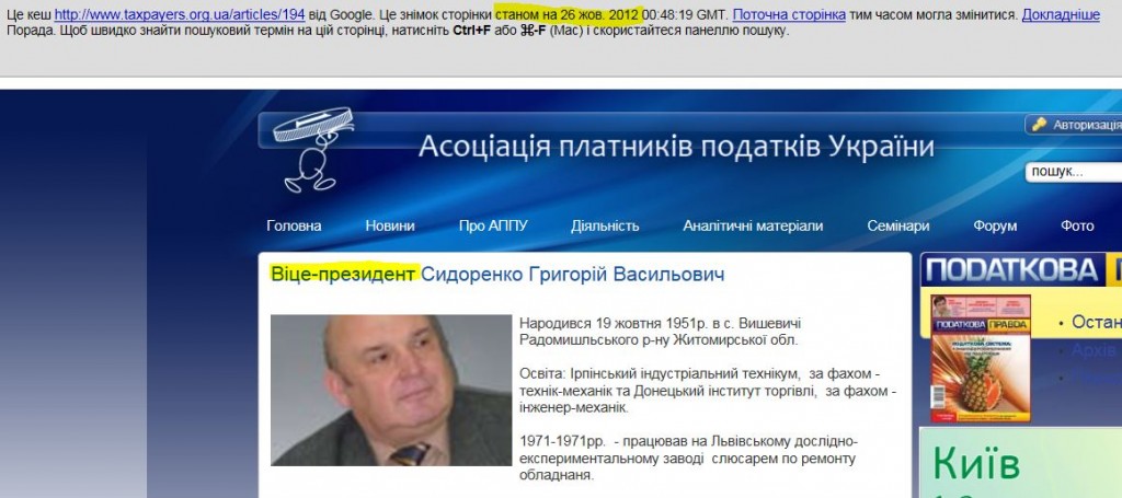 В свою чергу «Наші Гроші» повідомляють, що інформація про те, що Григорій Сидоренко є віце-президентом АППУ була отримана з сайту Асоціації за цим посиланням 18 листопада. Однак після опублікування новини вона була звідти видалена. Разом з тим, в кеші ця сторінка збереглась, Google її востаннє фіксував 26 жовтня 2012 року (див. принт-скрін). Також на сайті АППУ не було жодного повідомлення про виключення Сидоренка з лав Асоціації, яке можна було знайти пошуком по сайту.