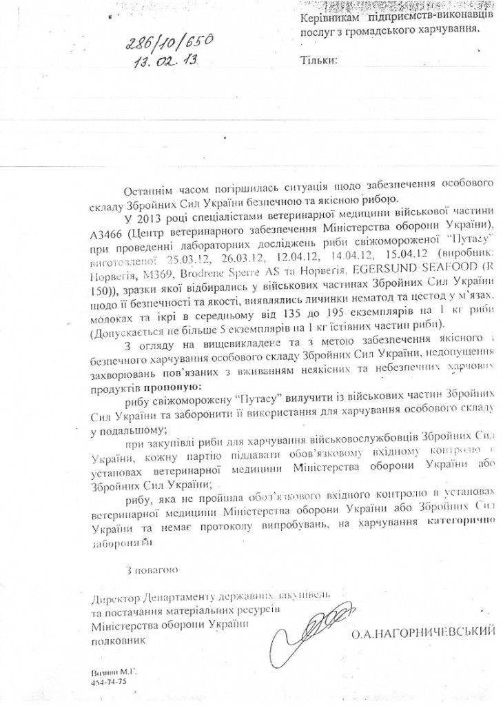 Директор департаменту держзакупівель Міноборони Олександр Нагорничевський запропонував вилучити всю свіжоморожену рибу путасу і заборонити її використання для харчування особового складу Збройних Сил України у подальшому. Про це йдеться у листі керівникам підприємств-виконавців послуг з харчування, який є в розпорядженні «Наших Грошей».