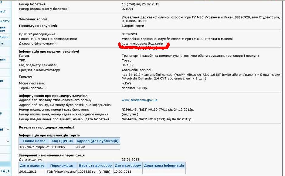 Нагадаємо, Управління державної служби охорони при ГУ МВС України в м. Києві 19 лютого за результатами тендеру уклало угоду з ТОВ «Ніко-Україна» на придбання шести автівок Mitsubishi загальною вартістю 1,29 млн грн.