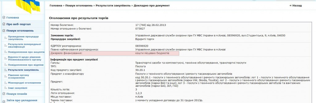 Як повідомляється у «Віснику державних закупівель» (оголошення 071094 у № 16 від  25.02.13), закупівля здійснена коштом місцевого бюджету, а не державного.