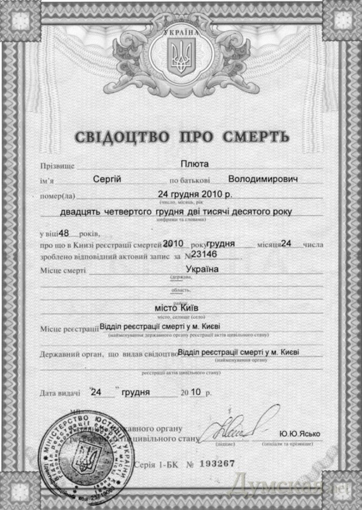 Плюта помер 24 грудня 2010 року від онкологічного захворювання. А 5 листопада того ж року він заповів Костусєву Mercedes 2010-го року випуску (вартістю 700-900 тисяч гривень).