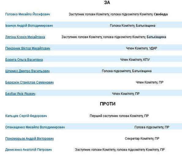 Комітет під головування Андрія Іванчука («Батьківщина») 3 квітня схвалив законопроект 2207, авторами якого є керівники та депутатами трьох опозиційних фракцій парламенту. “За” проголосували депутати від опозиції, комуністка Ольга Борита та два представники фракції Партії регіонів Станіслав Березкін та Яків Безбах, яких джерело “Наших Грошей” називає членами “групи Віктора Пінчука”. Проти законопроекту голосували чотири представники Партії регіонів.