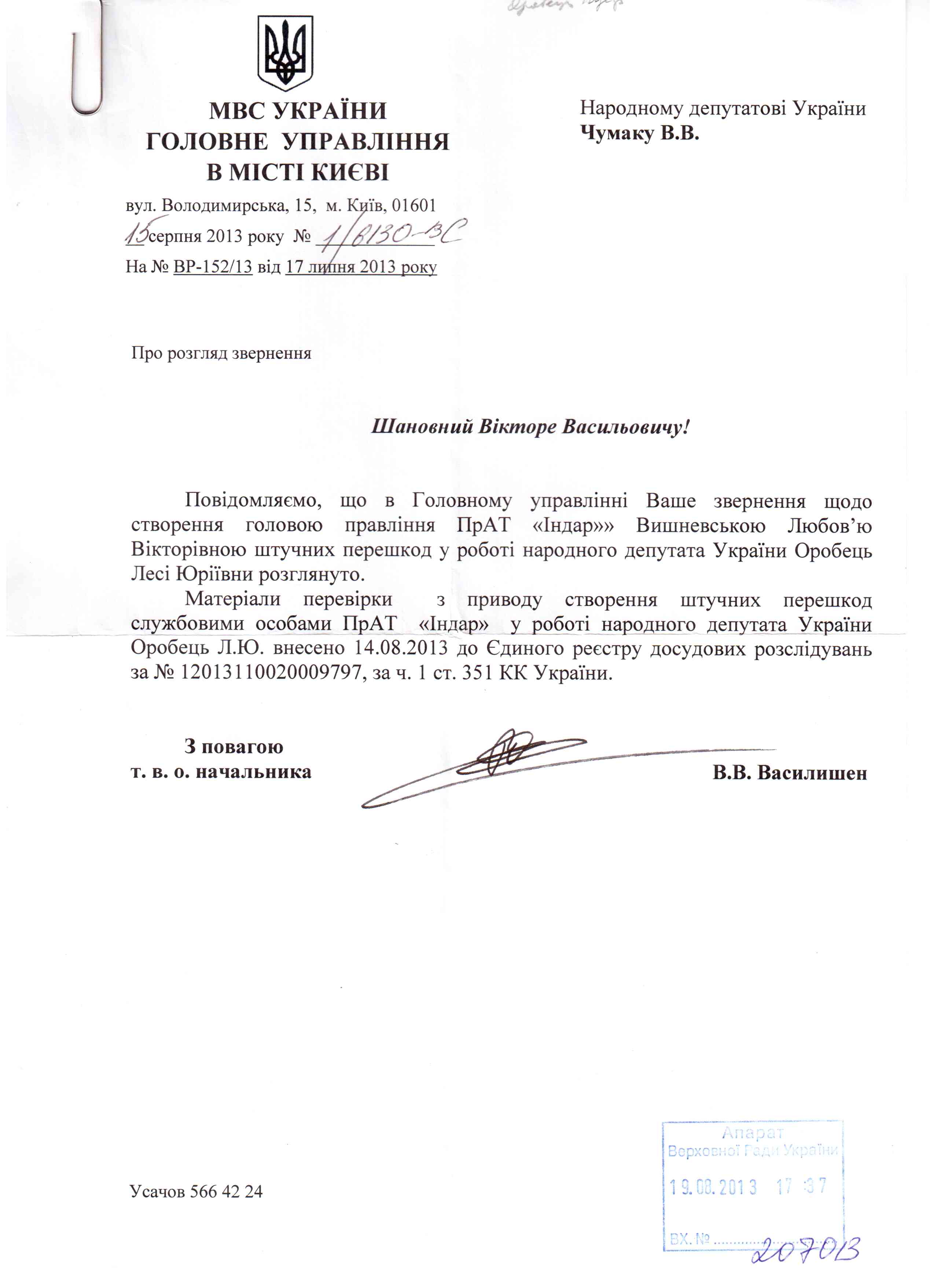 Головне управління МВС у м.Києві внесло до Єдиного реєстру досудових розслідувань матеріали перевірки з приводу створення штучних перешкод службовими особами ПрАТ «Індар» роботі народного депутата Лесі Оробець. Дані про порушення справи внесено до реєстру 14 серпня за номером 12013110020009797.