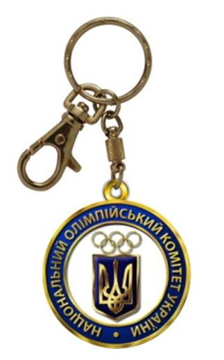 брелок1Брелоки з символікою НОК України. Виготовляється з  латуні, товщиною 3 мм., методом холодного штампування та вакуумного лиття. Поверхня брелоку має гальванічне покриття проектного золота 999,9 проби (0,1 мкм), та покривається кольоровою холодною емаллю (білого і синього кольору), а зверху заливається полімерним покриттям – «лінзою».  Брелок має  форму кола діаметром 32 мм.