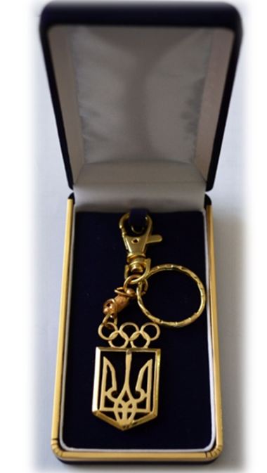 брелок12Брелоки з символікою НОК розміром 42х24 мм,   виготовляється з латуні. Поверхня брелоку має гальванічне покриття проектного золота 999,9 проби (0,1 мкм).Виріб запаковується у оксамитовий футляр синього кольору з золотистим обідком по контуру та тисненням логотипу Національного олімпійського комітету України.