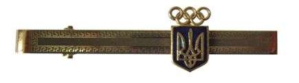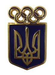 значокЗначки НОК з латуні Л-63, розмір: 27мм- висота, 16 мм – ширина. Значок має форму герба України з просіченими олімпійськими кільцями зверху, покривається гальванічною позолотою та фарбується в синій колір (кільця теж профарбовуються). Поверхня значка покривається епоксидною  прозорою смолою.