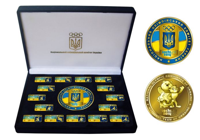 набір значківНабір значків НОК в футлярі.Медаль «СОЧІ-2014» виготовляється методом холодного штампування + вакуумного лиття  із латуні. Медаль має гальванічне покриття проектного золота 999,9 проби (0,1 мкм),  та  форму кола діаметром 60 мм.  Товщина медалі – 4 мм.