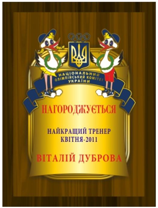 плакеткаПам’ятна плакетка розміром 221х300 мм (зі спеціальним отворами для кріплення на стіну), на яку кріпиться металева пластина, розміром 180 х 255 х 1,5 мм. На пластині зображено лелеченят, що тримають герб  Національного олімпійського комітету, виготовлений методом вакуумного лиття, розміром 63 х 38 х 2мм,  з прорізними кільцями та має гальванічне покриття проектного золота 999,9 проби (0,1 мкм). Сама пластина виготовляється методом хімічного гравіювання та покрита гальванічною позолотою. Усі написи та малюнки покриті яскравими епоксидними емалями.