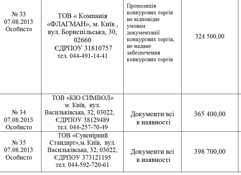 На тендер подавало заявку вартістю 324 тис грн. фірма «Флагман», однак її відхилили через відсутність забезпечення торгів та невідповідність пропозиції вимогам НОКу.