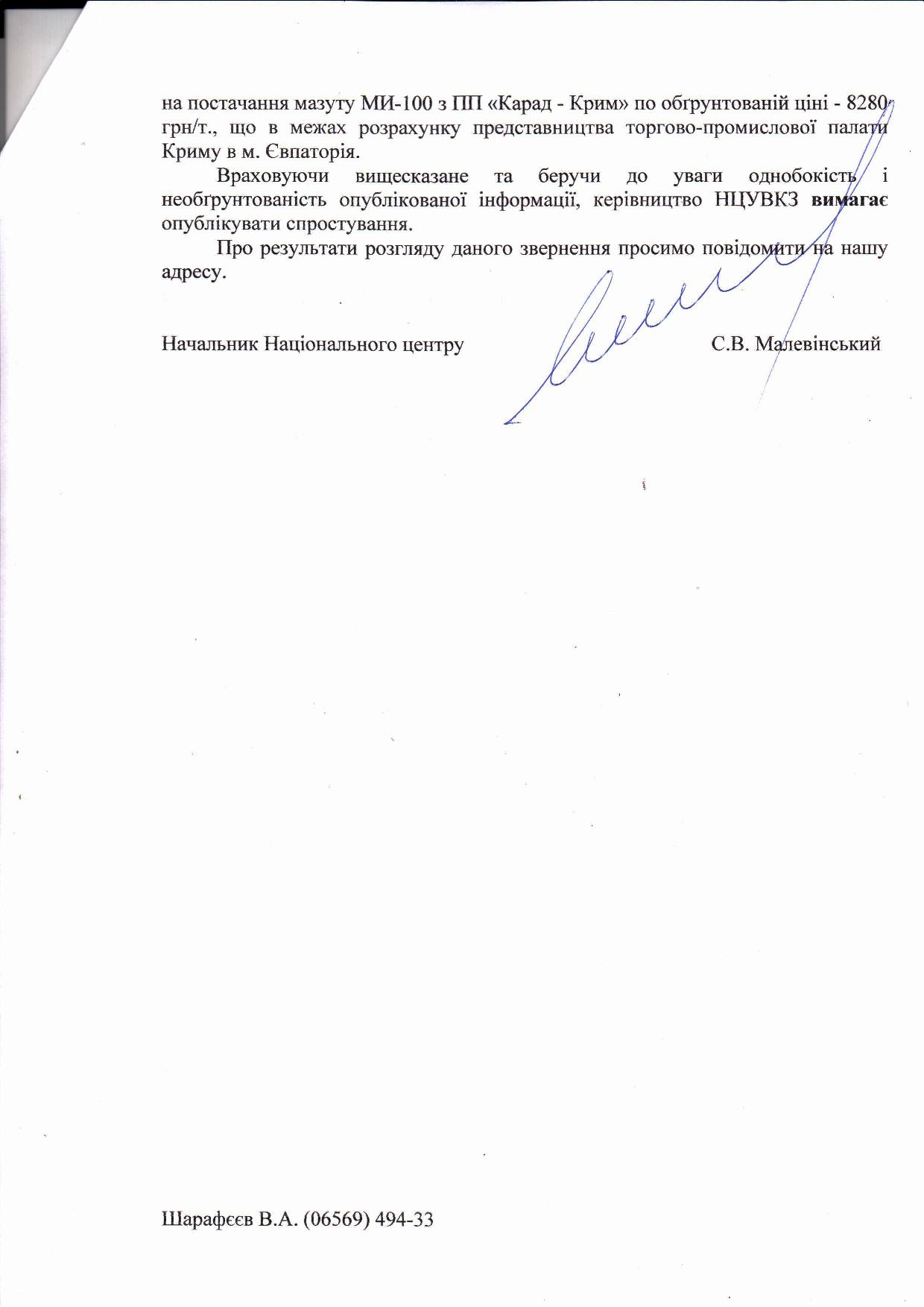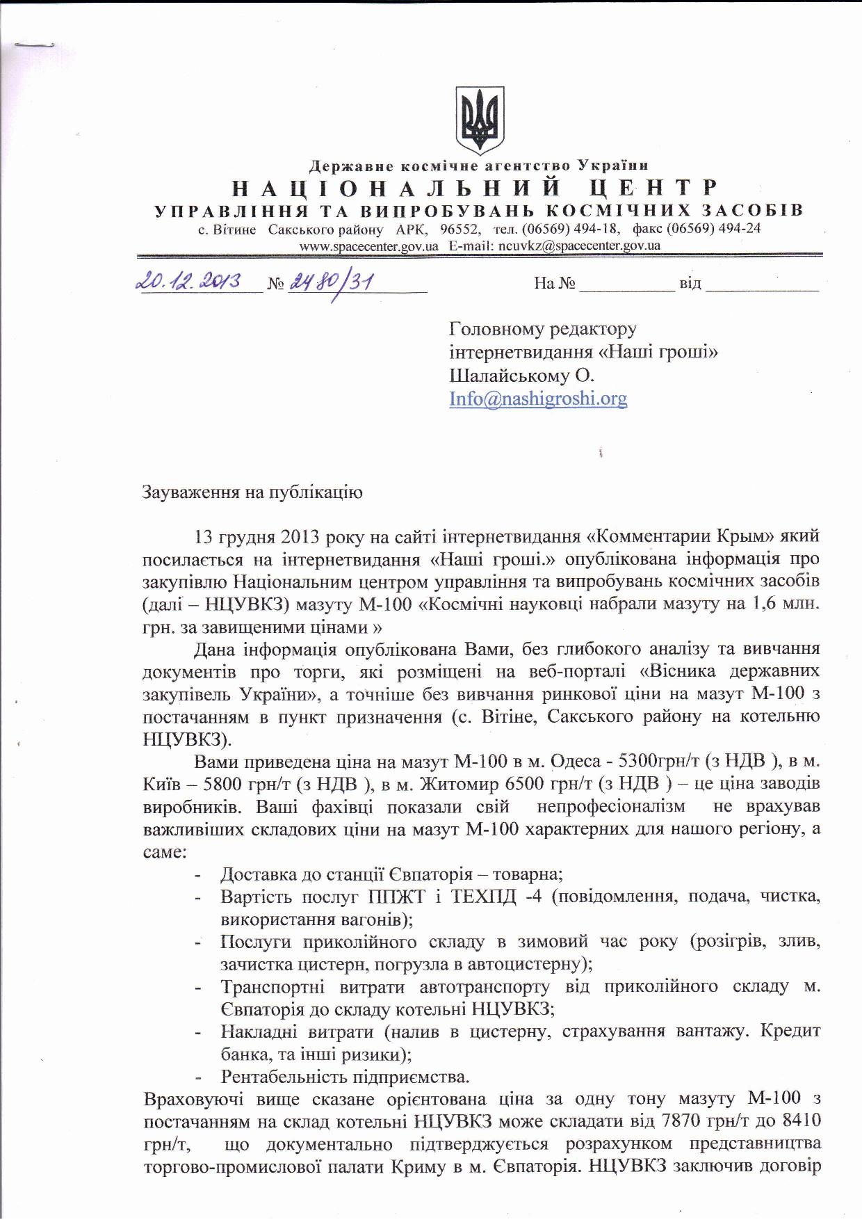 Після публікації до «Наших Грошей» начальник Національного центру С.В.Малевінський. Він стверджує, що отримана на тендері ціна є обґрунтованою за рахунок низки витрат, повязаних з доставкою палива.