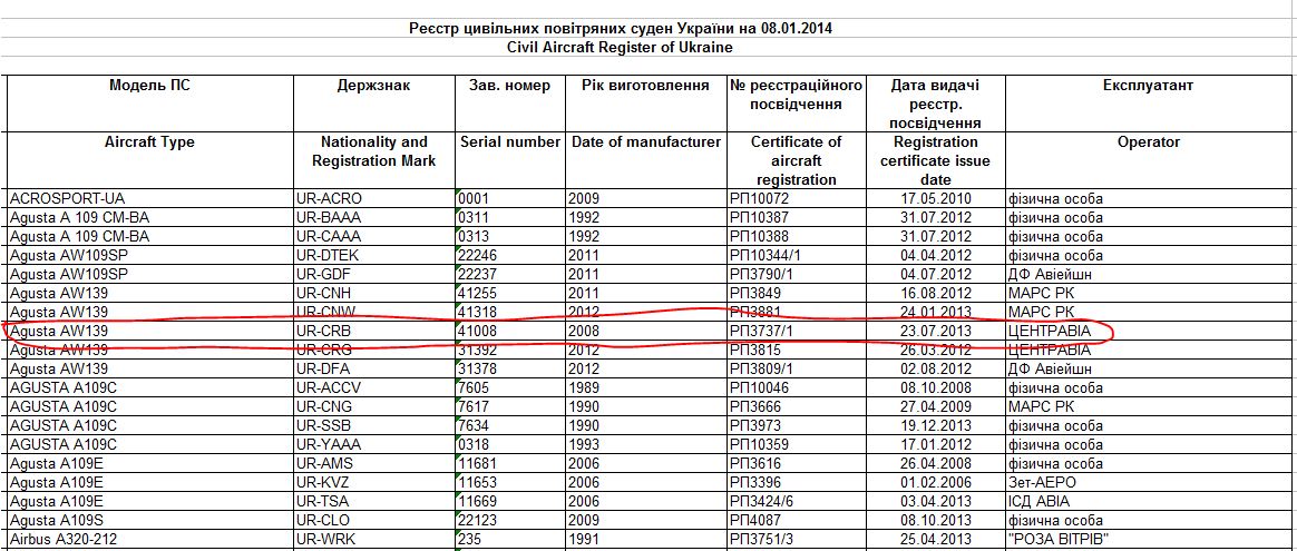 Після цього спотерри зафіксували пересування Agusta AW 139 з бортовим номером UR-CRB у повітряному просторі України. Тобто вертоліт виконував польоти до того, як Державіаслужба видала реєстраційне посвідчення. Хоча в обґрунтуванні закупівлі послуг з оренди вертольота було вказано, що «вертоліт Augusta 139 бортовий номер UR-CRB є єдиним екземпляром в Україні, допущеним до експлуатації в ТОВ «Центравіа», що підтверджується висновком Міністерства транспорту та зв`язку України та Управлінням державної охорони України».