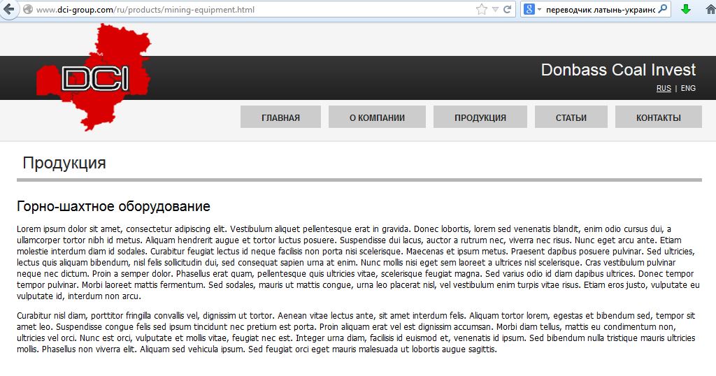 Разом з тим, розділ «Продукція» містить запис на латинській мові. Одне з речень цього тексту «Aliquam tortor lorem» перекладається як «Поліція мучитель в інтернеті».