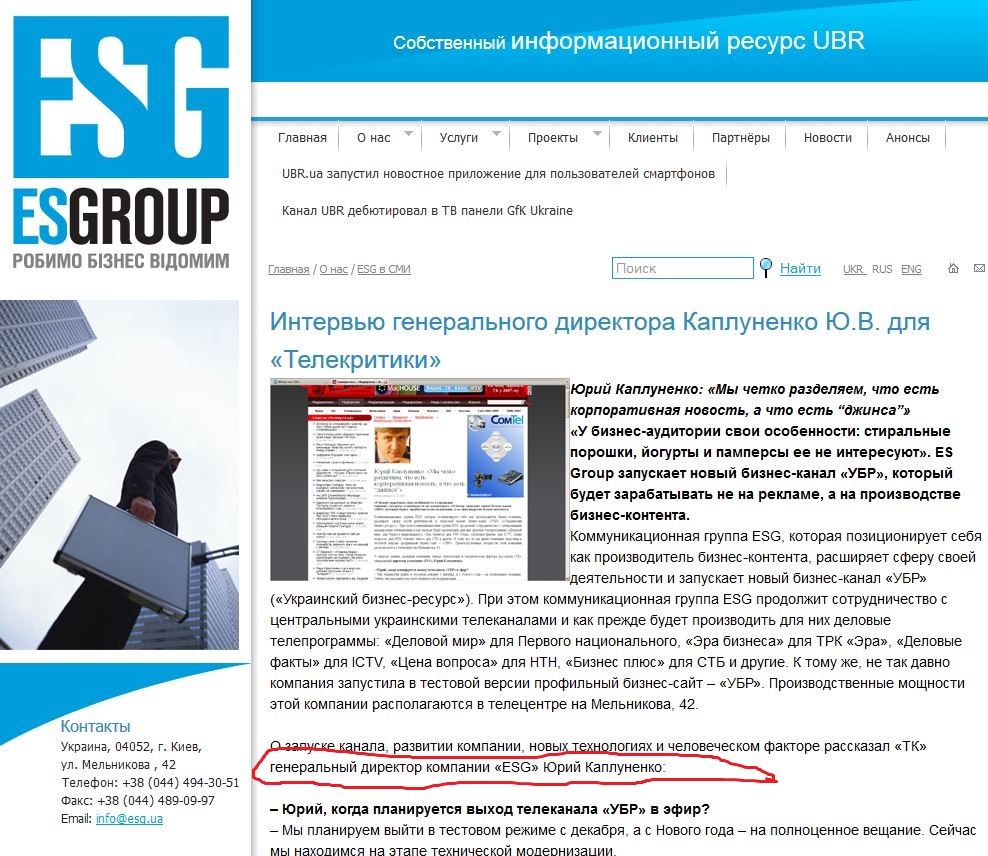 На це «Наші Гроші» повідомляють наступне. Юрій Каплуненко давав інтервю у якості генерального директора компанії ESG і цей факт відображено на сайті ESG.