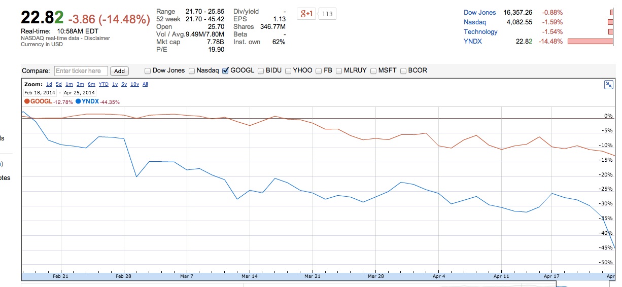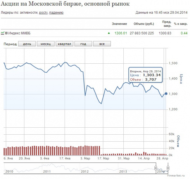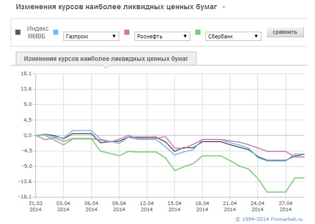 Падіння в Росії демонструють і фондові ринки. Наприклад, індекс ММВБ на кінець квітня знизився на 14% в порівнянні з показником на початок січня.