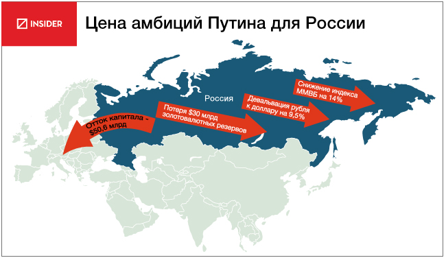 Втеча капіталу з Росії в першому кварталі 2014 року перевищила минулорічний показник в 1,8 рази і склало $50,6 млрд. Цей показник лише трохи менше, ніж за весь 2013 і 2012 роки: $5,97 млрд і $53,9 млрд відповідно.