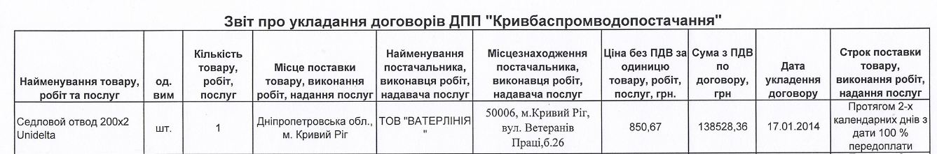 сідловий для КРДПП «Кривбаспромводопостачання» 17 січня уклало угоду з ТОВ «Ватерлінія» на постачання сідлових відводів 200х2 Unidelta на 138 тис грн. Відповідне оголошення було опубліковано у «Віснику державних закупівель» 20 травня.