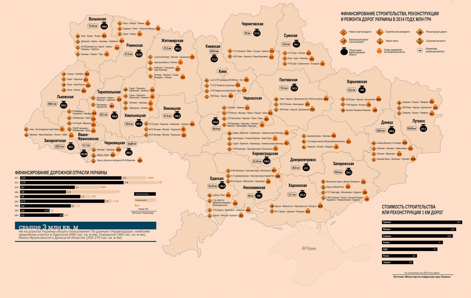 За даними «Вісника державних закупівель», у 2013 році найбільші шляхові тендери було проведено у Донецькій області – 1,0 млрд грн. на утримання та 1,3 млрд грн. на ремонт доріг. Відтак на ремонт доріг області, в якій зараз точаться бойові між українською армією та озброєними терористами, цього року виділено майже у чотири рази менше від вартості ремонтних підрядів минулого року, коли президентом був донеччанин Віктор Янукович.