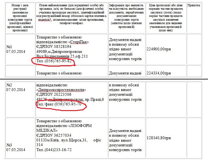 З невідомих причин у протоколі розкриття пропозицій вказано контактний телефон «СтеріПаку» (056)765-95-82, який належить «Дніпроекспрестехнології».