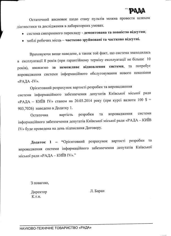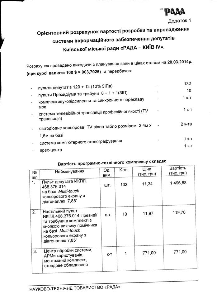 Після опублікування цієї інформації керуючий справами Київради Володимир Бондаренко (УДАР) опублікував у фейсбуці повідомлення кошторис реконструкції і додав, що «це не остаточна сума, бо розробники системи “РАДА” чітко вказали про можливість коригування ціни через коливання курсу валют».