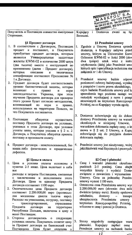 Заступник Коломойського по Дніпропетровськый ОДА Борис Філатов на своїй сторінці у Facebook оприлюднив копії договорів між «Авіасом» і польською фірмою «Maskpol». Згідно з цими договорами, закупівельна ціна за одиницю на бронежилети складала € 1 100, а на шоломи – €185, тобто по курсу НБУ – близько 18 тис грн. і близько 3 тис грн. відповідно.