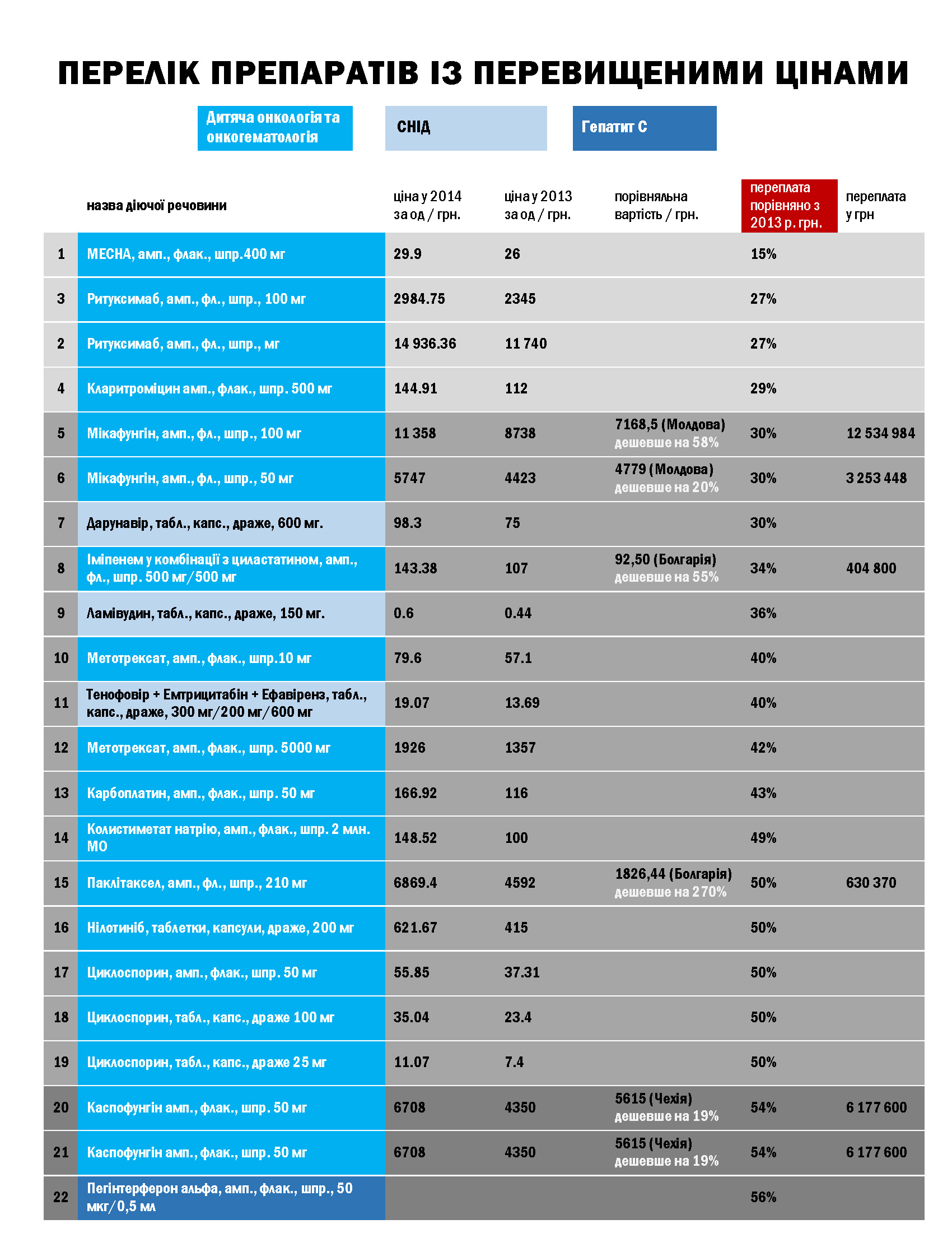Так, наприклад, ціни на препарати з дитячої онкології були завищеними на 40%-60%, по деяким позиціям, як, наприклад, дитячий гемодіаліз, ціни були завищеними до 300%.