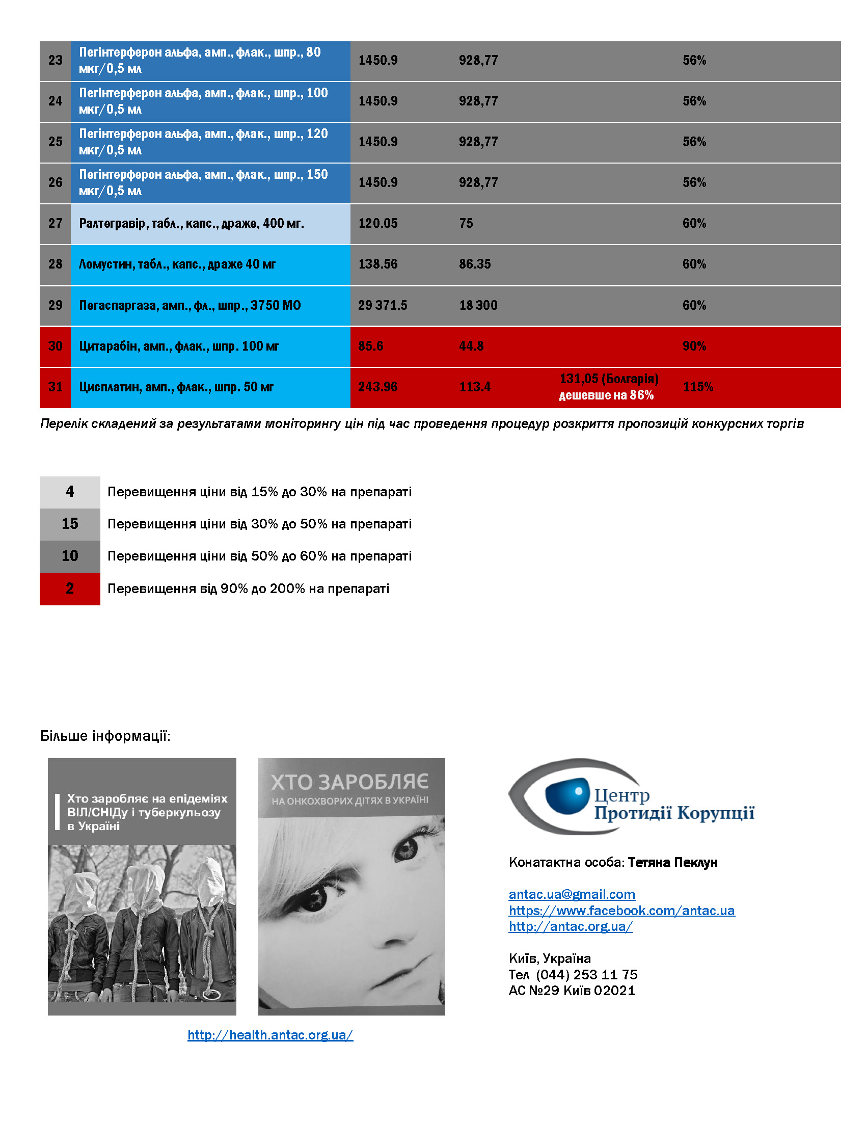 Ціни, заявлені більшістю учасників торгів, є необґрунтованими для України. «Ми порівняли ціни на ті ж самі препарати в сусідніх країнах, таких як Молдова, Болгарія, Чехія. Там аналогічні препарати у десятки разів дешевші, – стверджує Олена Щербан, юрист «Центру протидії корупції». – Таке значне перевищення цін є підставою для звернення в Антимонопольний комітет щодо можливої змови фармацевтичних компаній та імітації конкуренції заради надприбутків», – додала вона.