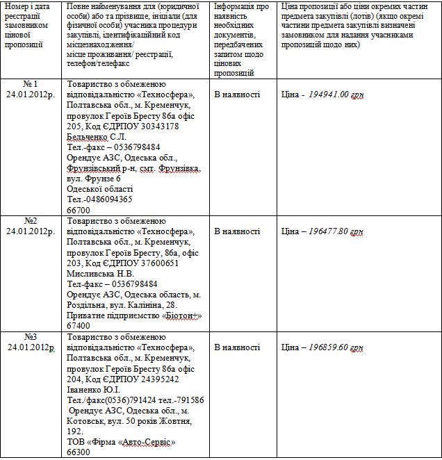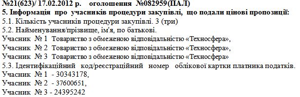 Зауважимо, що у звіті про проведення цієї закупівлі у пункті, де перелічуються учасники, в усіх трьох позиціях вказано ТОВ «Техносфера». Очевидно, це помилка. Так само як і те, що у протоколі розкриття пропозицій у трьох пропозиціях також вказана фірма «Техносфера».