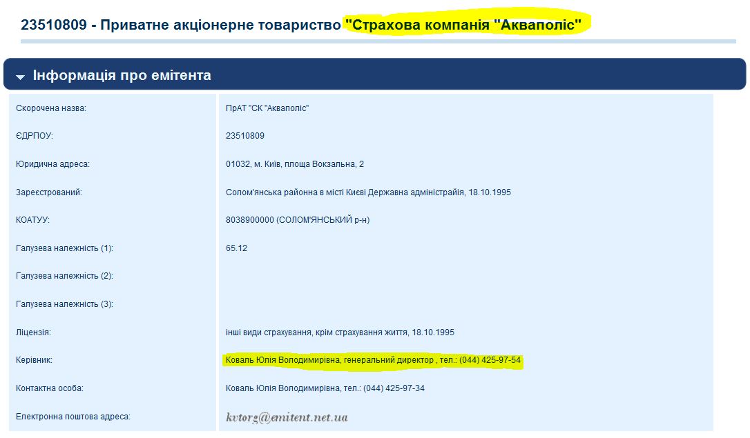 Окрім того у протоколі розкриття пропозицій конкурсних торгів контактний номер «Ексімтранса» записаний (044) 425-97-54. Цей же номер є офіційним телефоном вказаної вище страхової «Акваполіс» Сацюка.