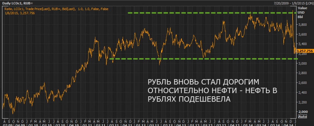 Минулого року вважалось, що бюджет Росії «сходиться», якщо нафту продавати по 3 700 рублів за барель. Тобто у випадку глобального здешевлення нафти треба адекватно «опускати» рубль. Фактично точка перетину нафти і російських грошей була на $61 за барель і 61 рублі за долар. Довкола цього показники бовтались до Нового року, після якого вступив в силу новий бюджет.