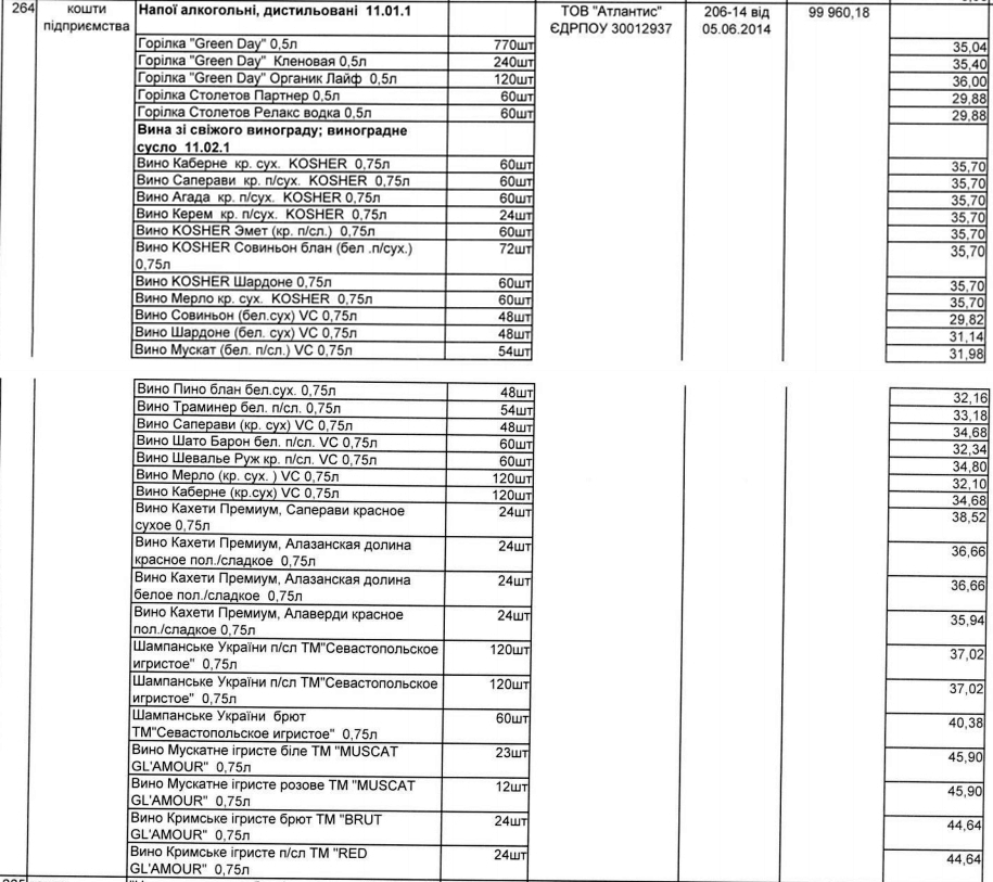 Придбано 2821 пляшок різноманітного алкоголю, половину з яких (1250 пляшок) припадає на горілку.
