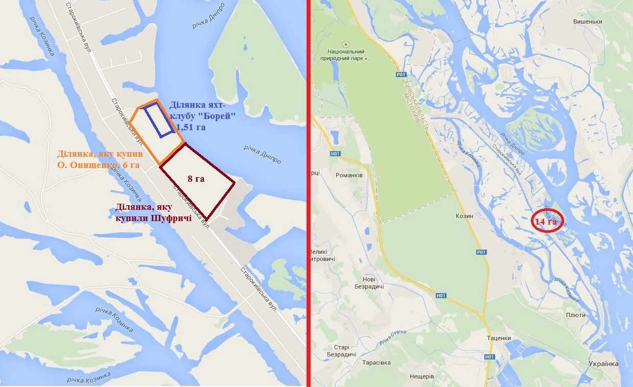 Починалось усе для депутатів-олігархів оптимістично. У 2009 році нардепи Олександр Онищенко і Нестор Шуфрич отримали у власність відповідно 6 га і 8 га. У гарному місці – на березі Дніпра, біля Козина. Ділянки брали поруч, напевно, щоб зекономити на паркані.