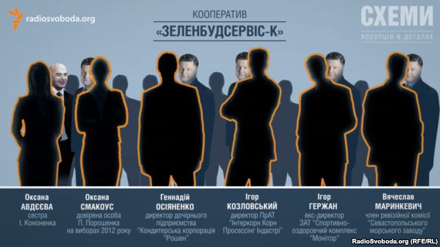 Спочатку обидві земельні ділянки загальною площею 1,10 гектара рішенням Київради були безкоштовно передані обслуговуючому кооперативу «Зеленбудсервіс-К», серед членів якого була сестра Кононенка Оксана Авдєєва, довірена особа Порошенка на виборах 2012 року і голова наглядової ради «Севастопольського морського заводу» Оксана Смакоус, Ігор Гержан, Наталія Шевченко, Віктор Рудзинський, Ігор Тарасенко, Оксана Скрипник, Тетяна Переверзєва, Олена Зайцева, Геннадій Осіяненко (відомий як директор корпорації «Рошен»), В’ячеслав Маринкевич (відомий як член ревізійної комісії ПАТ «Севастопольський морський завод»), Ігор Козловський (відомий як керівник ЗАТ «Інтеркорн»).