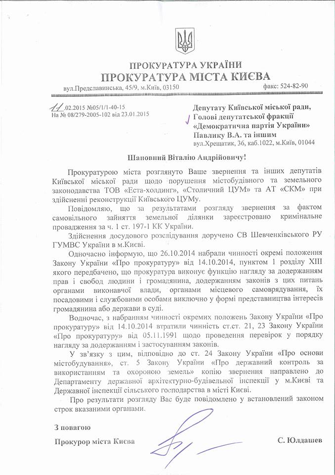 Провадження розпочато за фактом захоплення земельної ділянки (див. копію відповіді прокуратури). Щодо решти звинувачень будуть проведені перевірки.