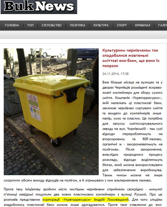 Нагадаємо, у 2013 р. стало відомо, що корпорація «Укрвторресурси» бере участь у національному проекті «Чисте місто» у Києві та Чернівцях, загалом в його рамках заплановане створення у 10 пілотних українських містах сучасних комплексів із переробки твердих побутових відходів. Запланована сума приватних інвестицій для будівництва сміттєпереробного комплексу в Києві була оголошена на рівні 488 млн. грн., у Чернівцях – більше 223 млн. грн. Однак з того часу про проект нічого не повідомлялося.