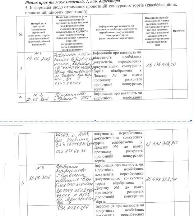 Окрім «Буд Електро Монтаж» на тендер подавалися ще два учасники. ТОВ «Карпати-ІФ» Андрія Болецького з пропозицією 36,18 млн грн., а також підприємство «Граніт» Львівської обласної організації Українського товариства глухих, яке пропонувало виконати роботи за 17,54 млн грн. Однак дешевша на 9 мільйонів пропозиція акцептована не була, хоча згідно з документацією конкурсних торгів єдиним критерієм оцінювання пропозицій була ціна. Протокол відхилення на «ВДЗ» відсутній.