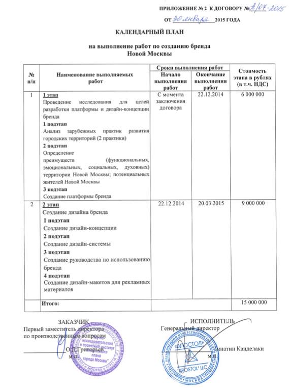 Але «Апостол» і Інститут генплану уклали угоду лише 30 січня 2015 року. При цьому термін виконання робіт по першому етапу так і залишили 22 грудня минулого року. Ось скан за підписами замовника і директора «Апостола» Тінатін Канделакі:
