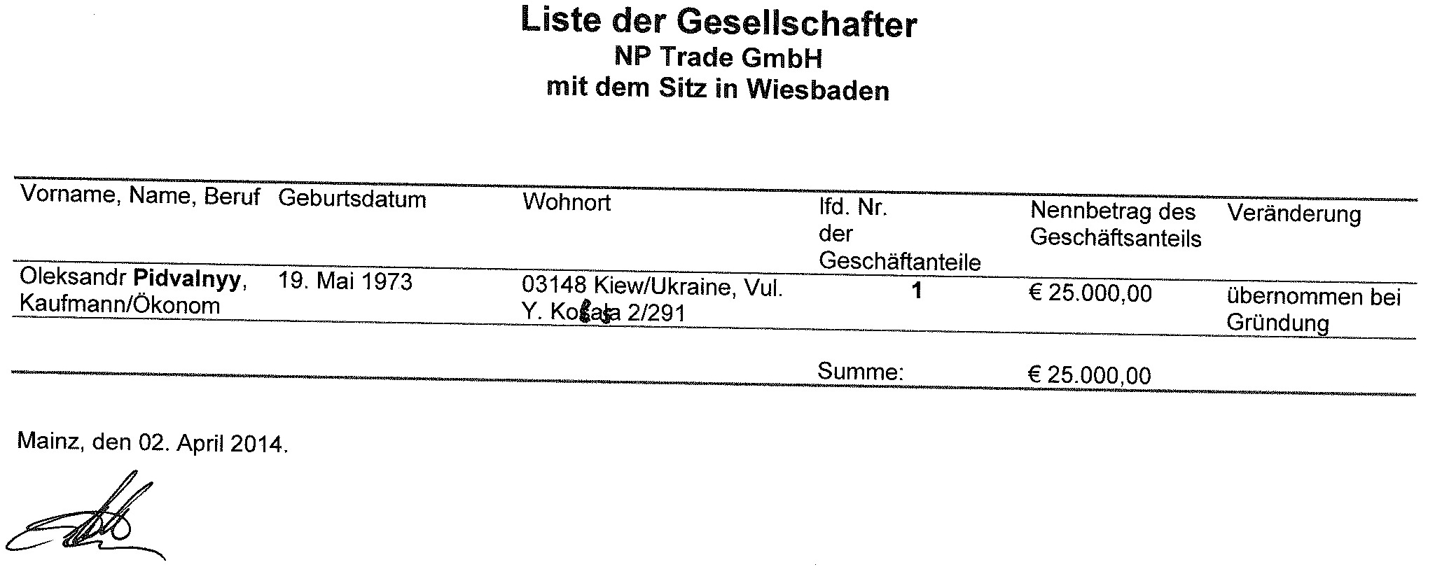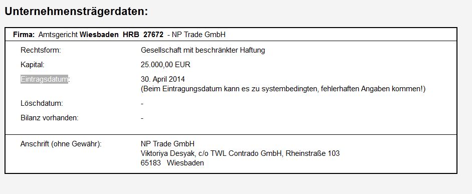 За даними німецького реєстру компаній, «NP Trade GmbH» була заснована у квітні минулого року, власником є Олександр Підвальний з Києва, а контактною особою зазначена Вікторія Десяк. За рік свого існування фірма виграла в Україні тендерів на 6,17 млн євро.