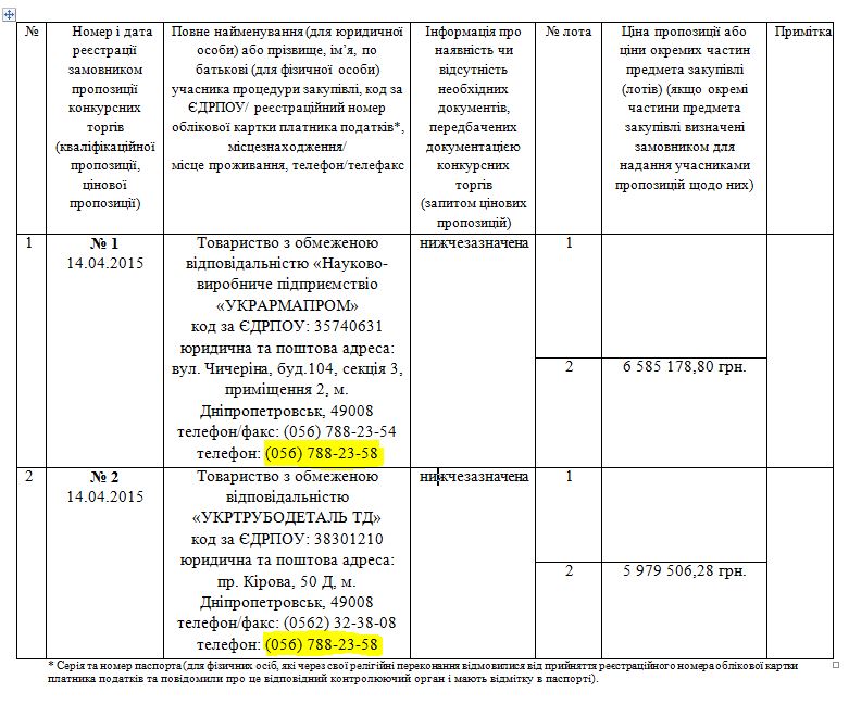 У протоколі розкриття пропозицій у фірм-конкуренток вказаний однаковий контактний номер