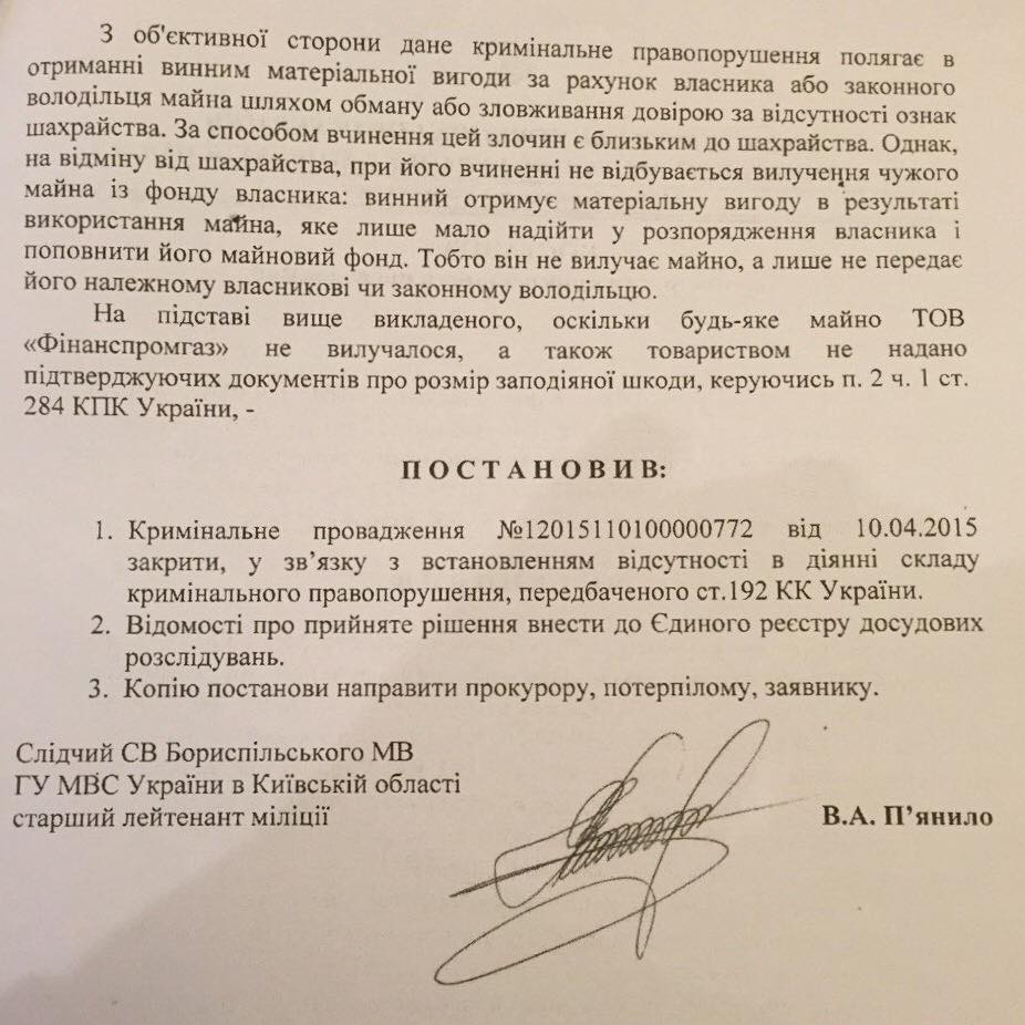Слідчий Бориспільського МВ ГУМВС в Київській області П’янило В.А. закрив кримінальне провадження, у рамках якого «Наші Гроші» були звинувачені у розміщенні «недостовірної інформації» щодо компанії «Фінанспромгаз». Постанову оприлюднив журналіст Артем Шевченко.