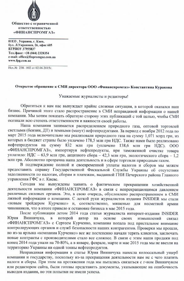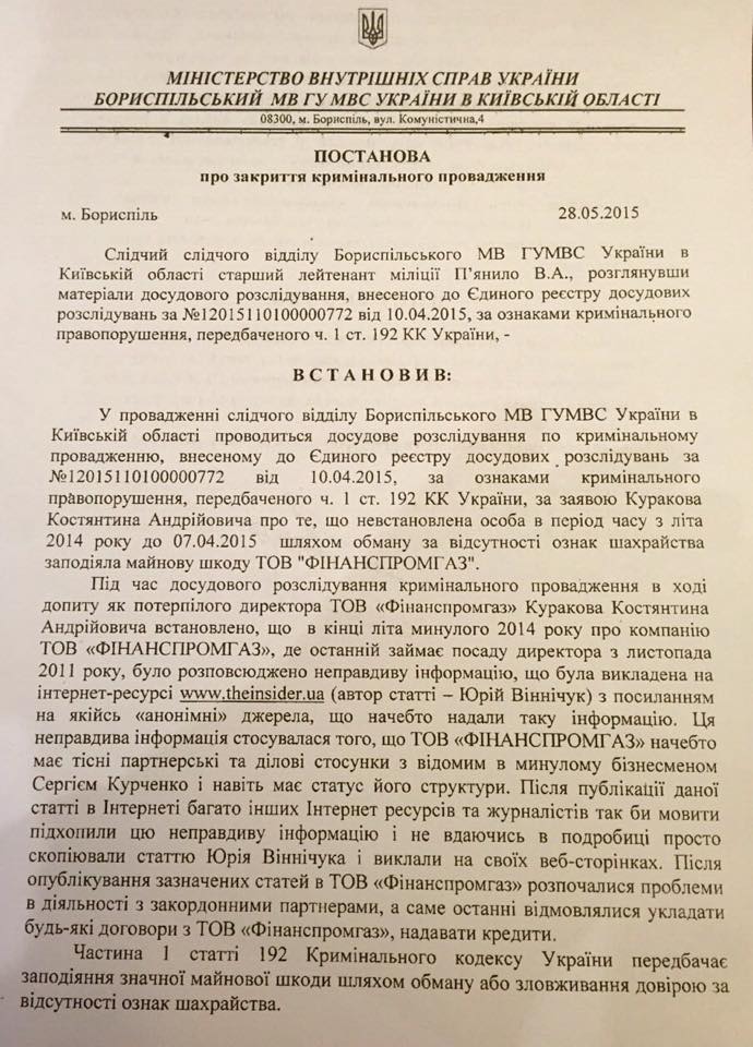 У постанові вказано, що провадження було порушено через «неправдиву інформацію» на сайті «Інсайдер» про зв’язки фірми «Фінанспромгаз» з Сергієм Курченком. Відтак фірма отримала проблеми з закордонними партнерами, які відмовлялись будь-які договори і надавати кредити.