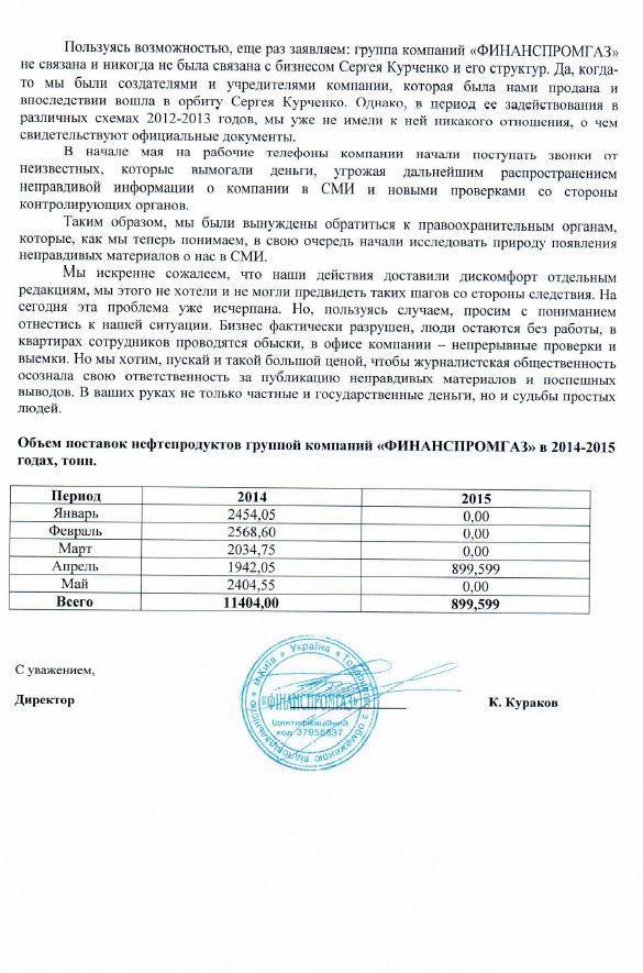 Після цих подій до «Наших Грошей» надійшов лист від директора «Фінанспромгазу» Костянтина Куракова. Він заявив, що його компанія не має жодного стосунку до Сергія Курченка.